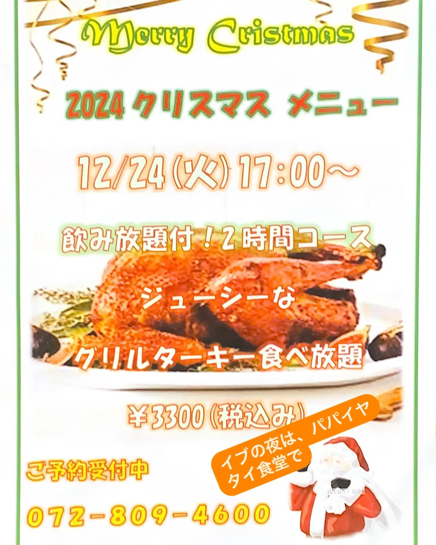 パパイヤX’mas 特別メニューします👏 12/24イヴの夜... パパイヤX’mas特別メニューします👏12/24イヴの夜は美味しい本場ターキーとタイ料理でHollyNight🎄🧑🎄#クリスマスイブ#ターキー#パパイヤタイ食堂#飲み放題#タイのクリスマス#タイ料理#うま辛い#枚方クリス…
